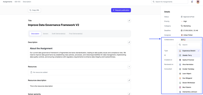 Introducing a new assignment role: Collaborator. A Collaborator can join in on shaping the assignment description upon invitation from an Assignment Owner or Project Consultant. The Collaborator can take the same actions as an Assignment Owner.
